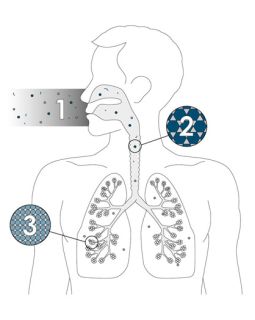 1 Fijnstof dringt ons ademhalingssysteem (de longen) binnen via neus en keel. 2|3 Grotere stofdeeltjes verdwijnen door te hoesten, niezen of slikken. 4 Kleinere stofdeeltjes kunnen tot diep in de l…